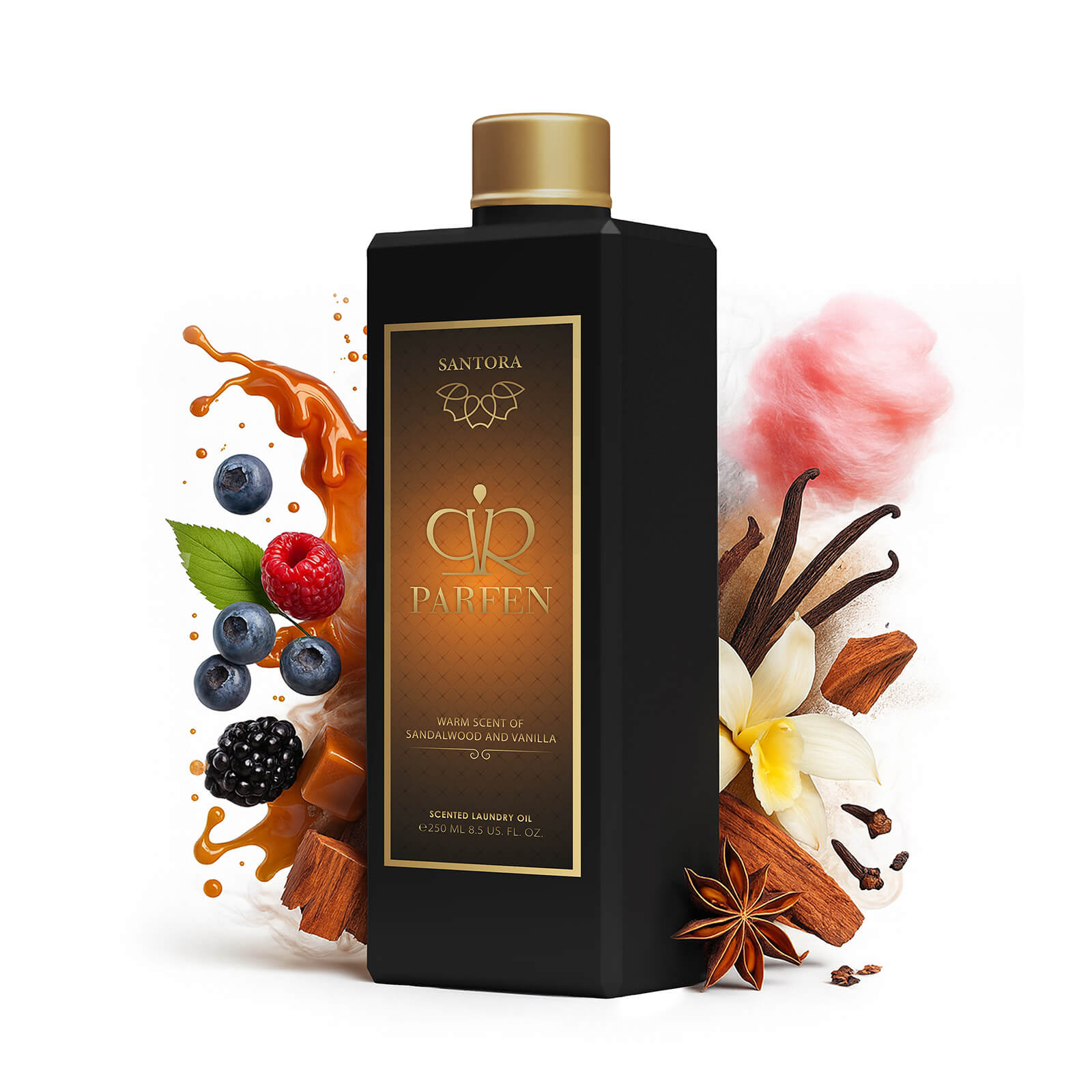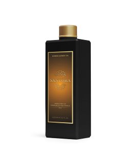 SANTORA je zavodljiv parfem za rublje. Nakon pranja ostavlja na tkaninama sladak gurmanski miris, omekšan balzamičnim tonovima sandalovine. Vaša odjeća ili posteljina obavijena je u tople note. Još dugo nakon pranja osjetit ćete slatku i delikatnu orijentalnu aromu.